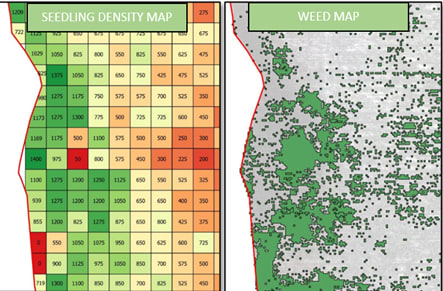 SKYLAB’s Seedling Counter uses machine learning and artificial intelligence to analyse drone images, automatically count all seedlings and differentiate them from weeds and other features. The resulting colour-coded digital grid maps show seedling and weed density, as well as relative vitality.
