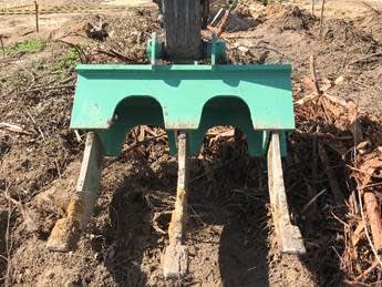 It is an excavator-based machine with a trident rod attachment, which is used, for deep soil preparation when dealing with cohesive soils with pedogenic horizons. The trident rod configuration is primarily designed for the special application of breaking densified and very hard soils in dry conditions.This subsoiler has a 1,3m width, 1,6m long central rod and 1,2m long side rods. The total weight of the attachment is 750kg.
